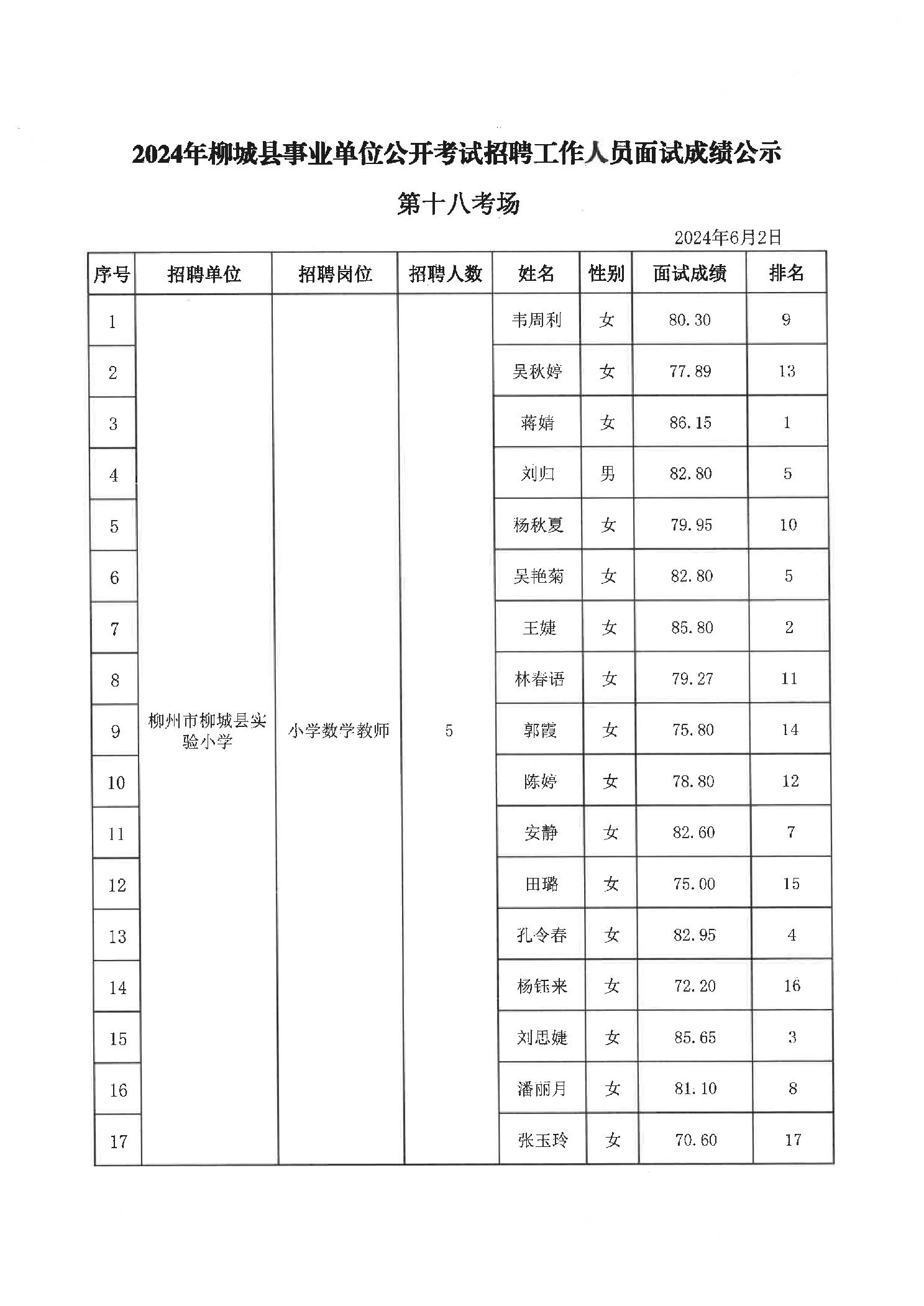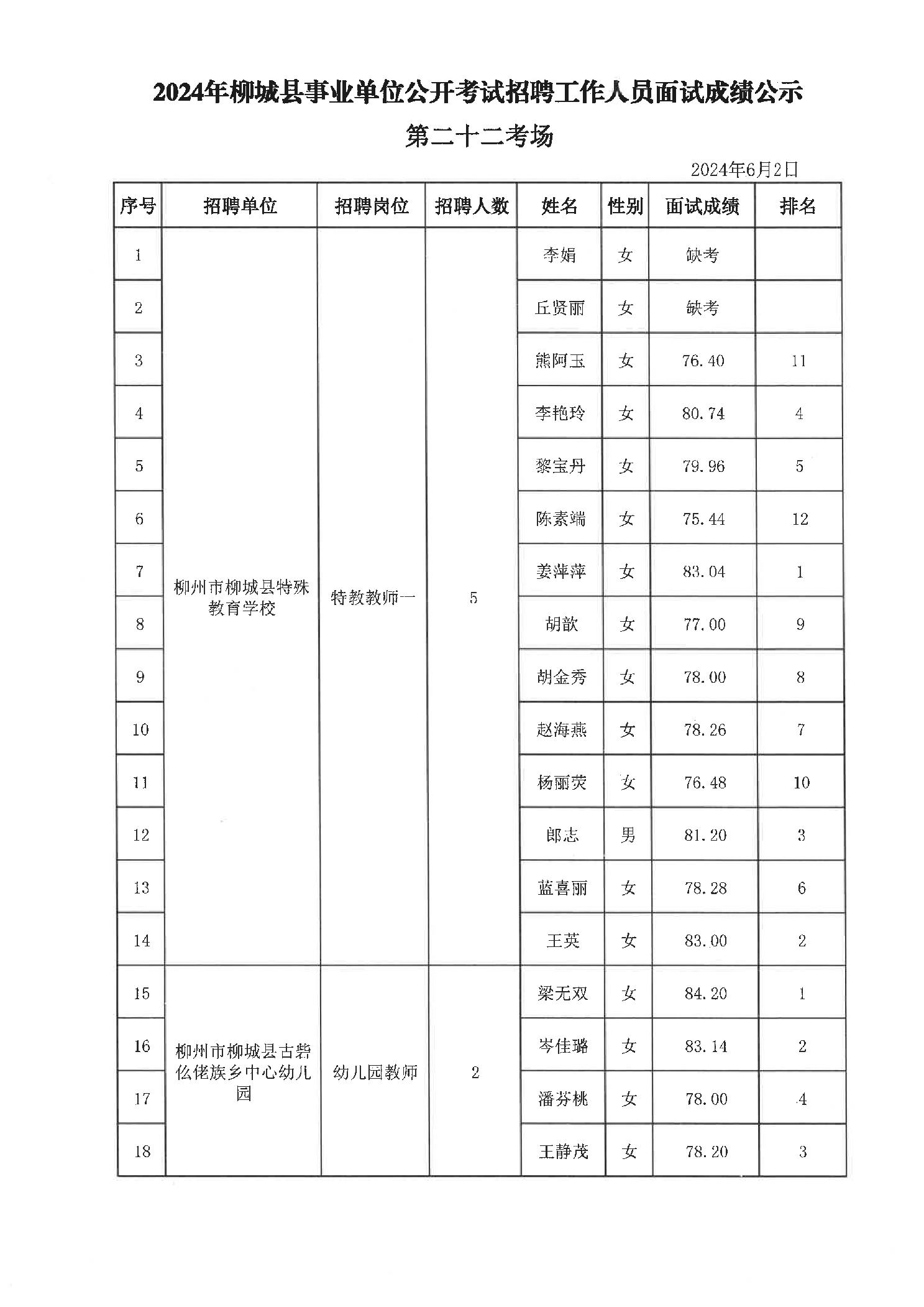 2024年柳城縣事業(yè)單位公開考試招聘工作人員面試成績公示