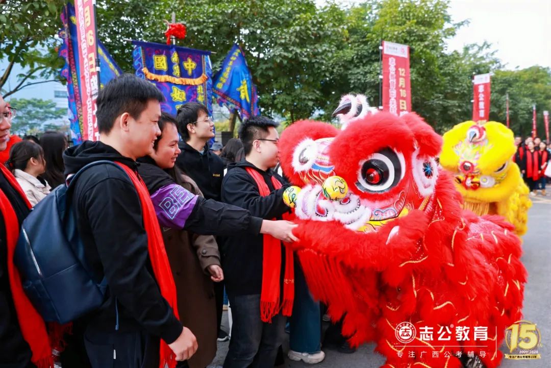 志公教育還專門請(qǐng)來(lái)了舞獅隊(duì),舞獅點(diǎn)睛是重頭戲,董事長(zhǎng)李勇帶領(lǐng)著公司領(lǐng)導(dǎo)們手持毛筆蘸取朱砂,對(duì)獅頭天庭進(jìn)行點(diǎn)睛。