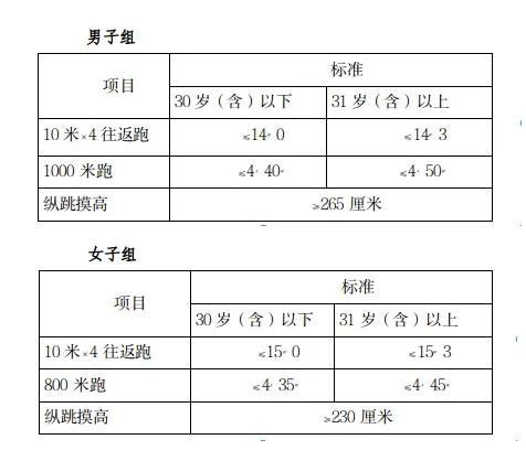 參照《關(guān)于印發(fā)公安機(jī)關(guān)錄用人民警察體能測評項(xiàng)目和標(biāo)準(zhǔn)(暫行)的通知》(人社部發(fā)〔2011〕48號(hào))的項(xiàng)目及測試規(guī)則,結(jié)合《公安民警體育鍛煉達(dá)標(biāo)手冊》成績標(biāo)準(zhǔn),本次體能測評的項(xiàng)目和標(biāo)準(zhǔn)如下: