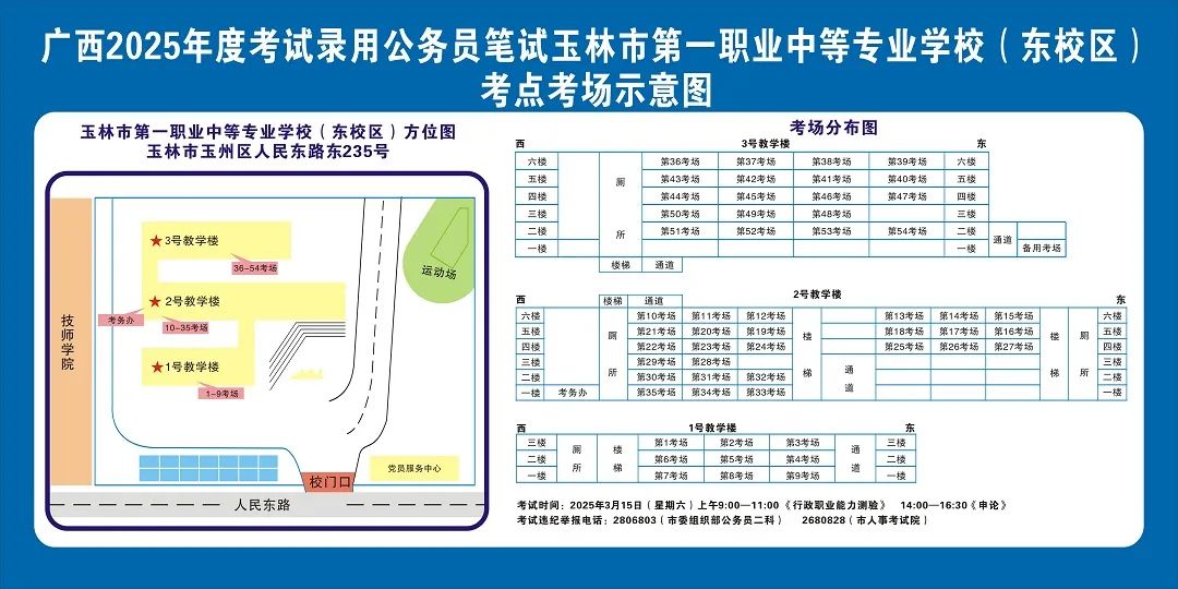 請(qǐng)?zhí)崆傲私獗救怂诳键c(diǎn)具體位置,熟悉考點(diǎn)周邊情況,特別是考點(diǎn)周邊的食宿、交通情況,合理做好食宿安排和出行計(jì)劃。需要特別注意的是:玉林市第一職業(yè)中等專業(yè)學(xué)??键c(diǎn)是設(shè)在該校的東校區(qū)(人民東路東235號(hào));玉林市第一中學(xué)考點(diǎn)是設(shè)在該校的運(yùn)嶺路校區(qū)(二環(huán)北路1228號(hào))!