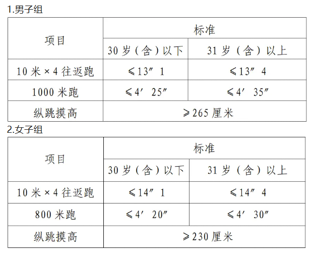 體能測評項目中,縱跳摸高的測試次數(shù)不超過3次,10米×4往返跑測評次數(shù)為2次,1000米/800米的測評次數(shù)均為1次。應聘勤務崗位的人員,體能測評三項全部達標的方為合格;應聘文職崗位的人員,體能測評三項有兩項達標的,視為合格。