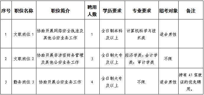 (六)同等條件下,優(yōu)先招聘公安烈士和因公犧牲公安民警、在職公安民警子女、退役士兵、見義勇為積極分子和先進個人、警察類或政法類院校畢業(yè)生、有政法工作經(jīng)驗的人員;