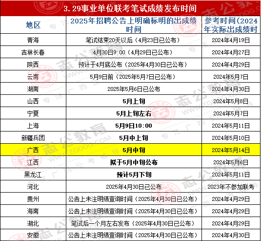 無論是青海還是貴州,或者是湖北,都是按照公告或去年出成績時(shí)間差不多的,那么2025年廣西事業(yè)單位筆試成績是否和2024年一樣為5月14日發(fā)布?