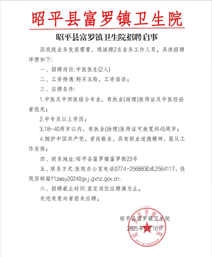 原文標(biāo)題:昭平縣富羅鎮(zhèn)衛(wèi)生院招聘啟事