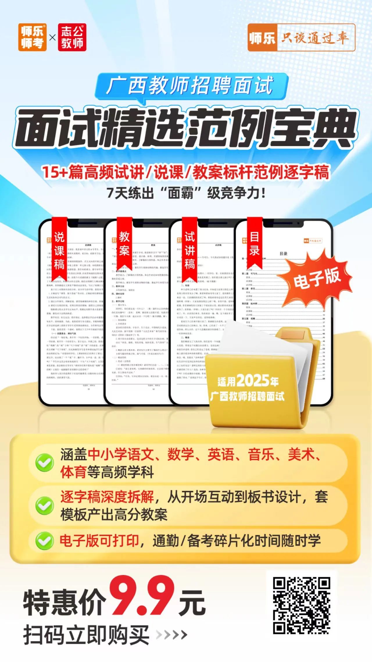 ??寫作邏輯+面試導(dǎo)入金句點撥 ?含13+篇試講+說課+結(jié)構(gòu)化 搶先體驗價:6.9元 ??14地市教招面試zhen題 了解試講/說課/結(jié)構(gòu)化形式及內(nèi)容 面試禮儀課 ??面試禮儀干貨介紹 正反面案例直觀對比 ??著裝、問候、儀態(tài)、言談禮儀等事項介紹 【師樂】廣西教招備考群 ??最新公告 備考資料 ??刷題打卡 考試交流