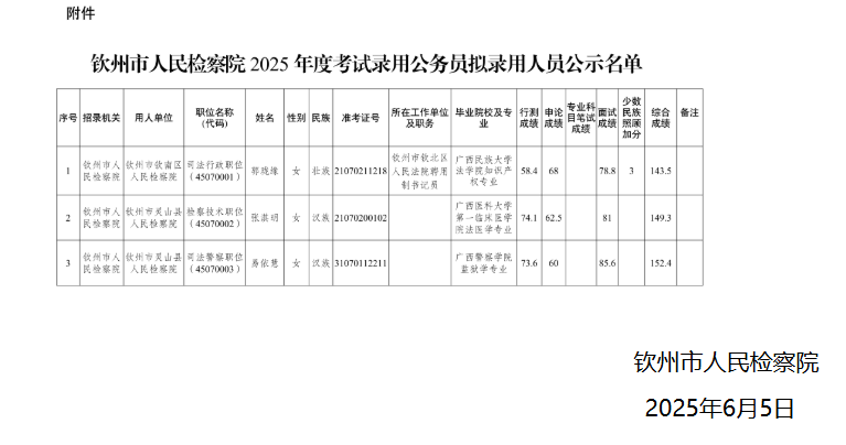 欽州市人民檢察院2025年度考試錄用公務(wù)員擬錄用人員公示