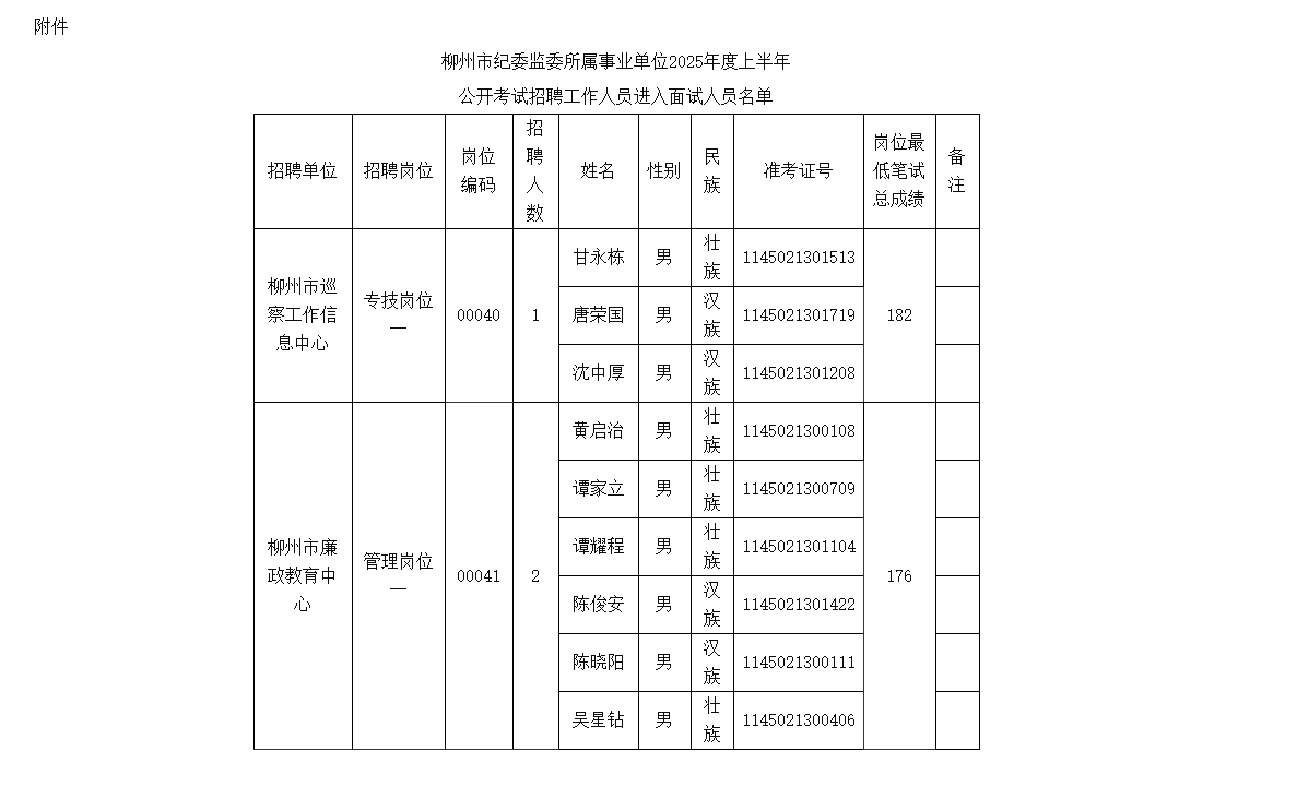 附件:《柳州市紀委監(jiān)委下屬事業(yè)單位2025年度上半年公開考試招聘工作人員進入面試人員名單》