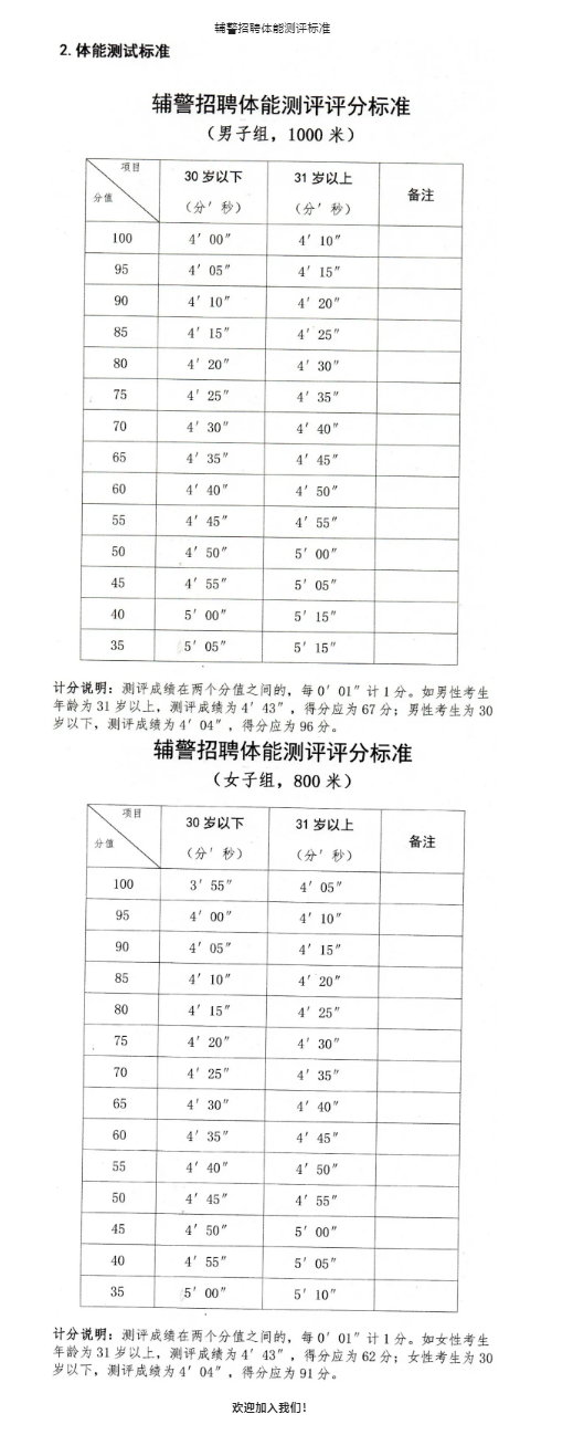 1.測(cè)試項(xiàng)目。長(zhǎng)跑(男子1000米跑,女子800米),體能測(cè)試計(jì)分?jǐn)?shù),滿分為100分,評(píng)分標(biāo)準(zhǔn)附后。