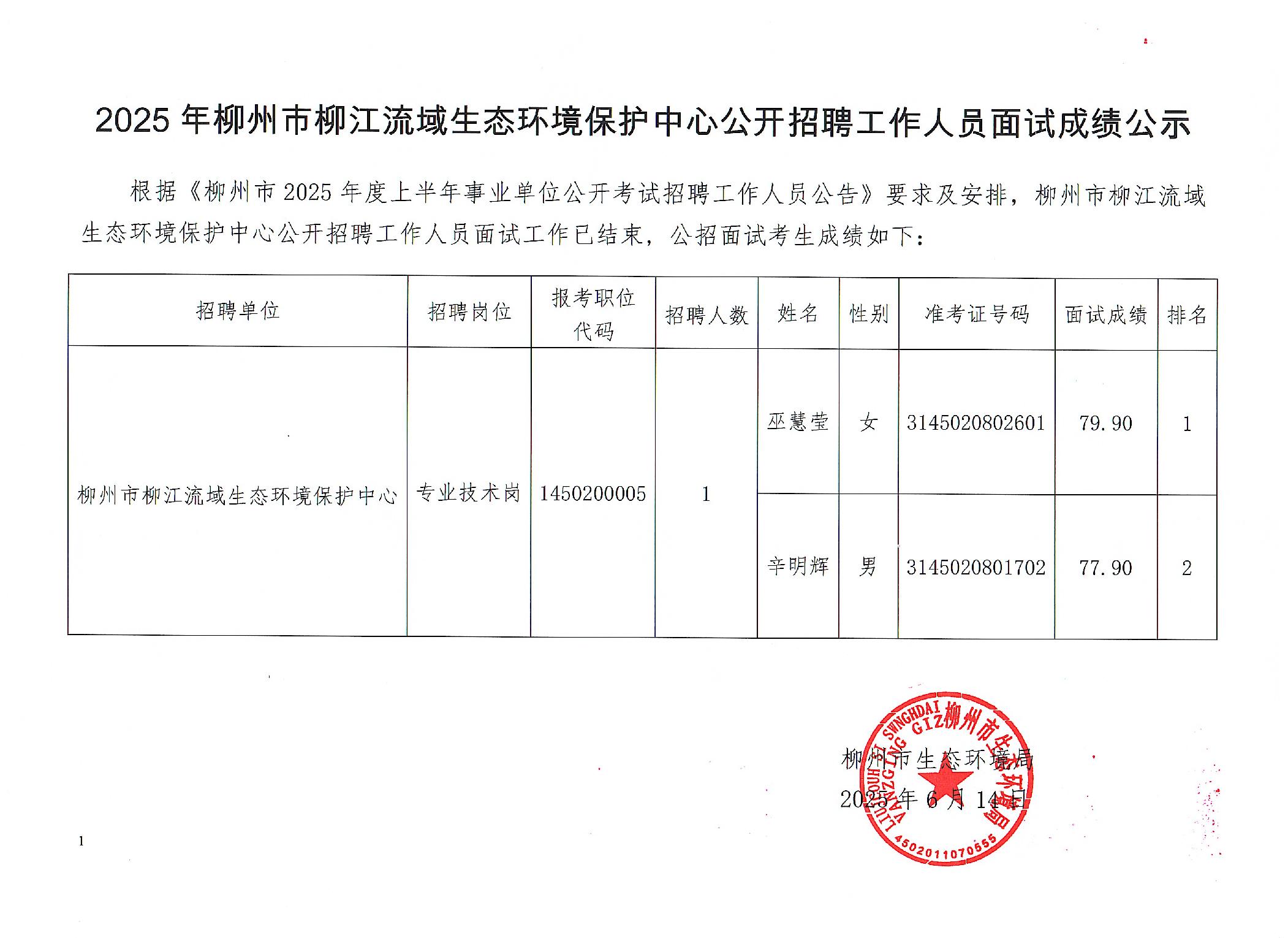 2025年柳州市柳江流域生態(tài)環(huán)境保護(hù)中心公開招聘工作人員面試成績公示