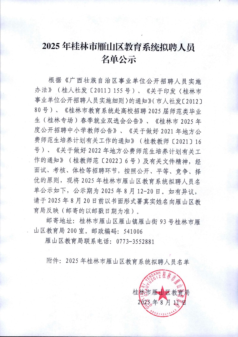 2025年桂林市雁山區(qū)教育系統(tǒng)擬聘人員名單公示