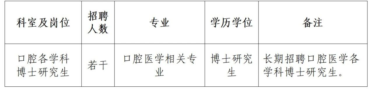 人才條件:50歲以下,口腔醫(yī)學(xué)相關(guān)專業(yè)研究生畢業(yè),獲博士學(xué)位。