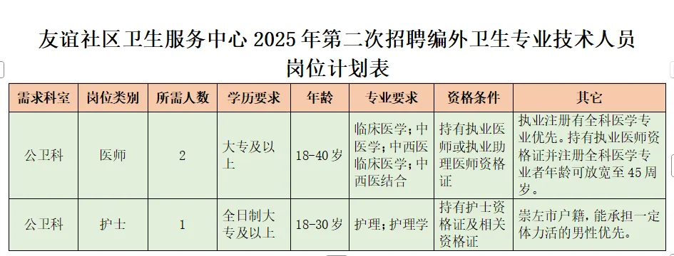 2025年崇左市江州區(qū)友誼社區(qū)衛(wèi)生服務中心公開招聘編外聘用衛(wèi)生專業(yè)技術(shù)人員公告