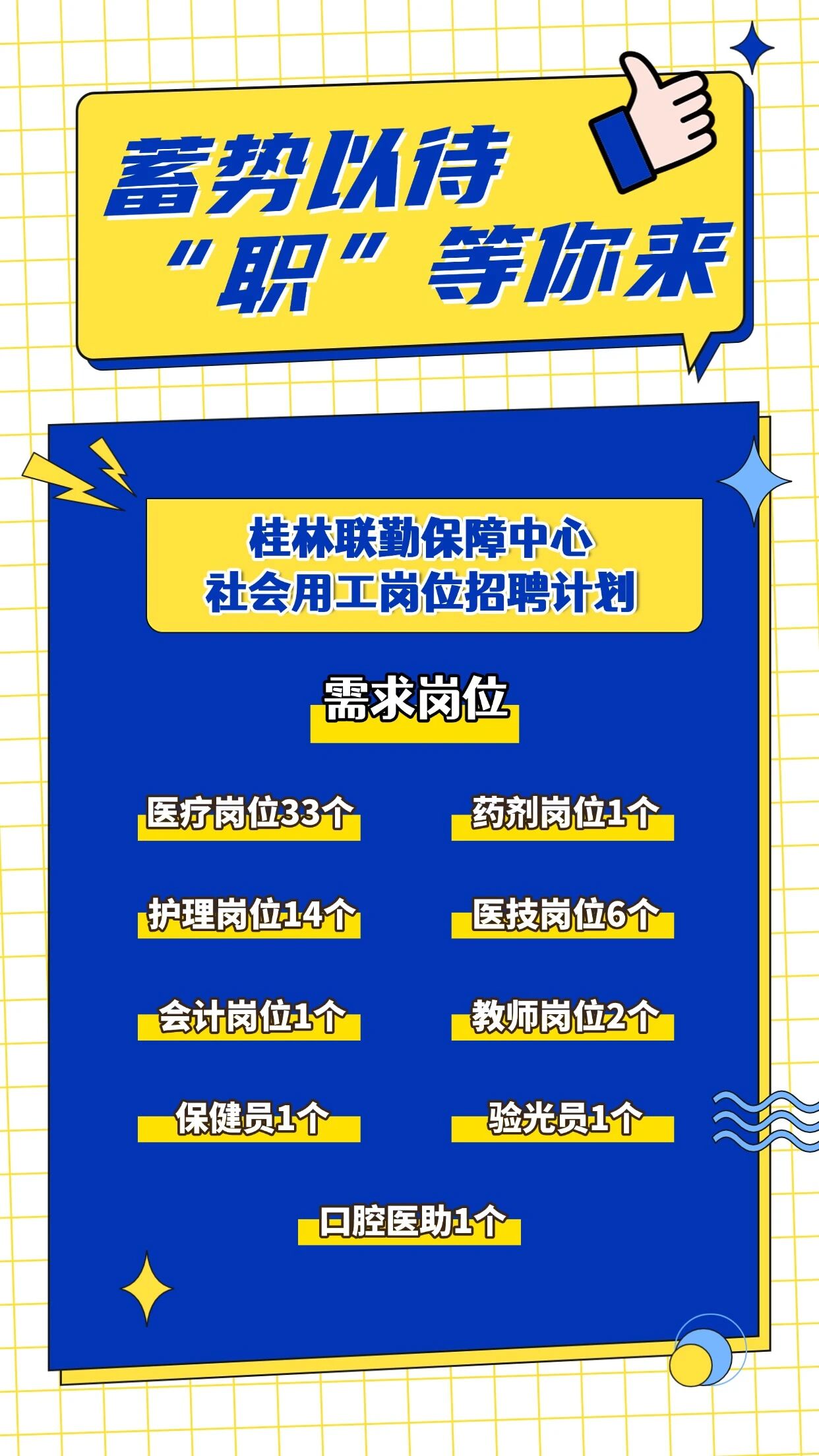 此次發(fā)布桂林聯(lián)勤保障中心社會(huì)用工崗位招聘計(jì)劃60個(gè),其中:專(zhuān)業(yè)技術(shù)崗位58個(gè)(醫(yī)療33個(gè)、藥劑1個(gè)、護(hù)理14個(gè)、醫(yī)技6個(gè)、會(huì)計(jì)1個(gè)、教師2個(gè)、保健員1個(gè))、工勤技能崗位2個(gè)(驗(yàn)光員1個(gè)、口腔醫(yī)助1個(gè))。