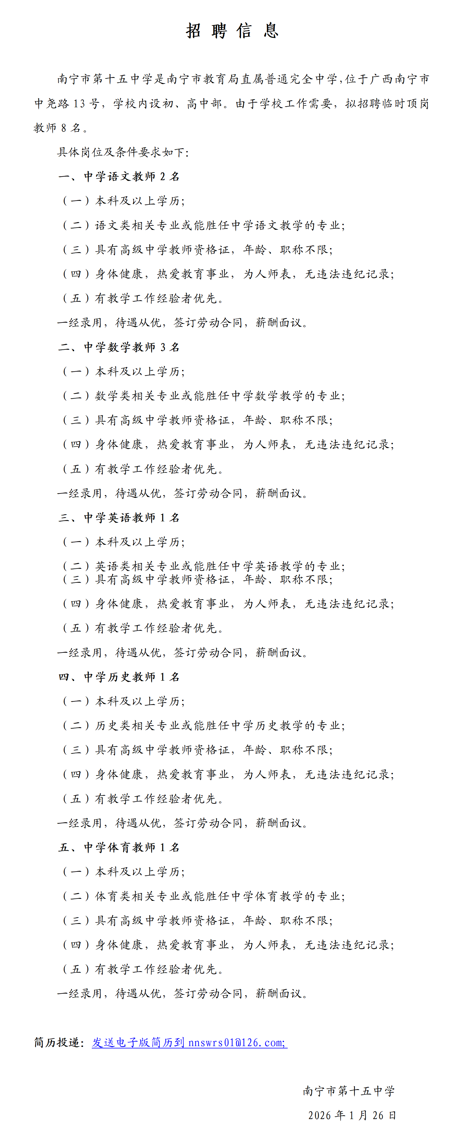 2026年南寧市第十五中學招聘