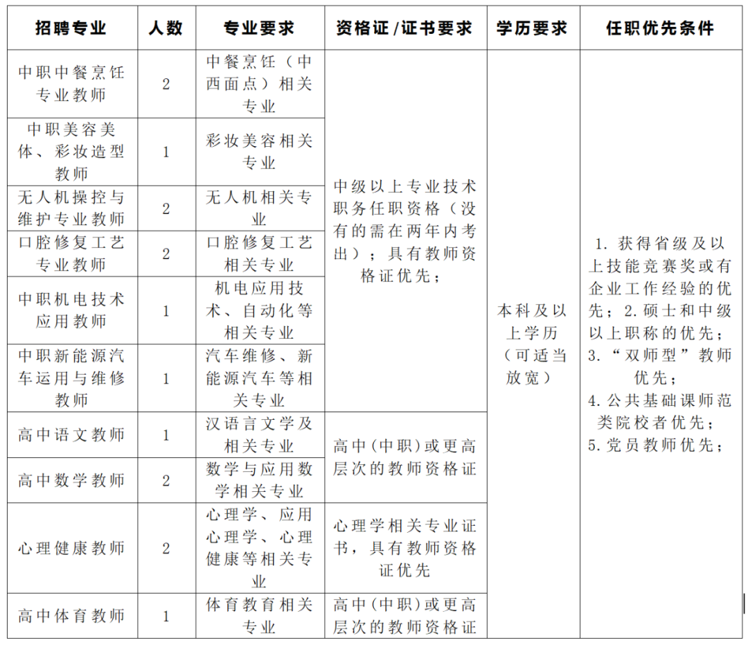 機(jī)電應(yīng)用技術(shù)、中餐烹飪、新能源汽車(chē)檢測(cè)與維修、平面設(shè)計(jì)、社會(huì)文化藝術(shù)、美發(fā)與形象設(shè)計(jì)專(zhuān)業(yè),各1人。