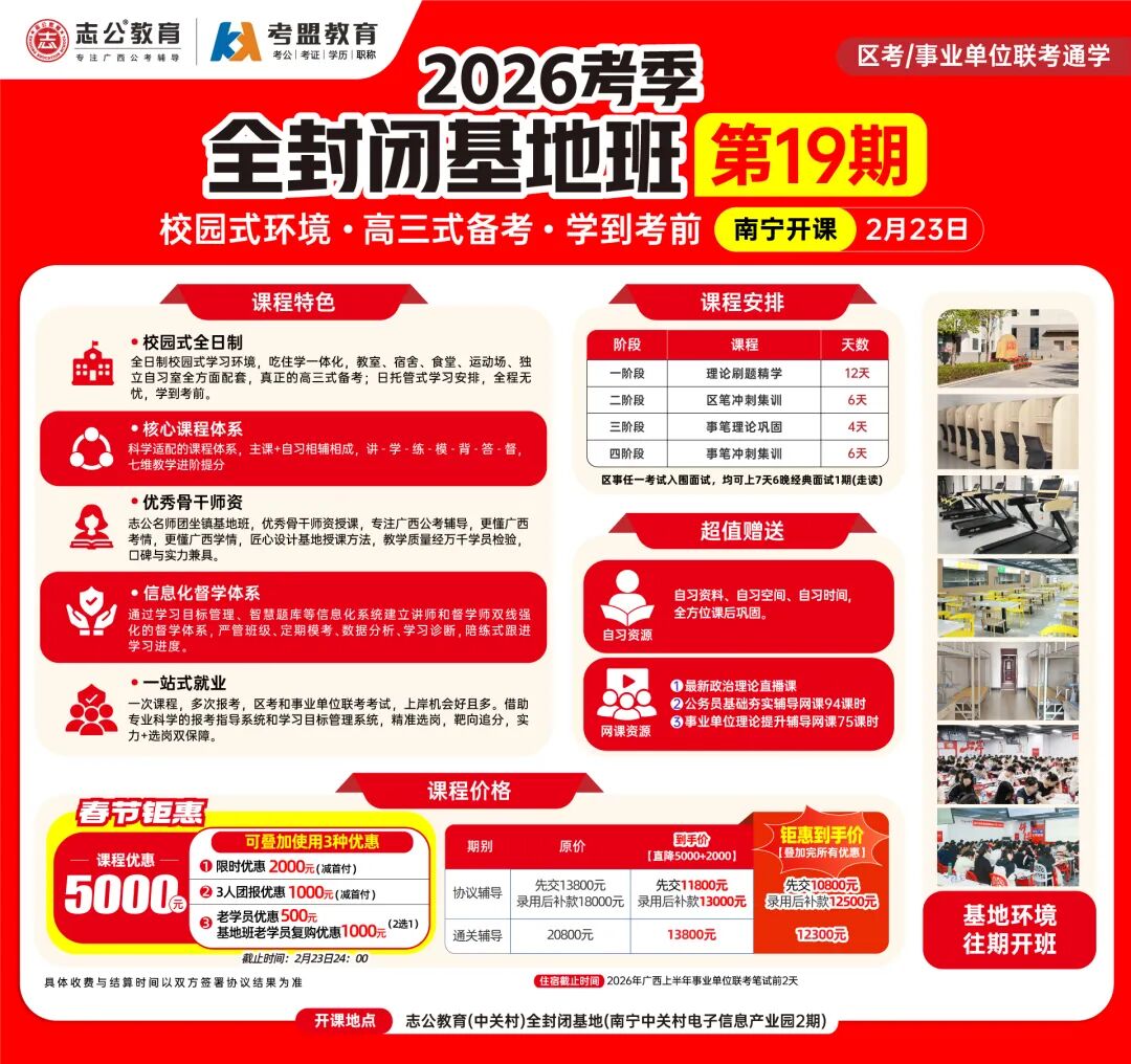 ?校園式環(huán)境,隔絕外界干擾:志公教育(中關(guān)村)2026考季全封閉基地班19期打造全日制校園式學(xué)習(xí)環(huán)境,高三嚴(yán)管式備考,一直可以學(xué)到考前。如果你自律性較差,需要一個(gè)好的學(xué)習(xí)氛圍和環(huán)境;如果你想要更快速上/岸,那你需要一個(gè)科學(xué)的學(xué)習(xí)體系,如果你想要考更好的職位,那你需要個(gè)性化和有效的提分方案,那么恭喜你,已經(jīng)找到了解決方法,請(qǐng)來志公教育全封閉基地班!
